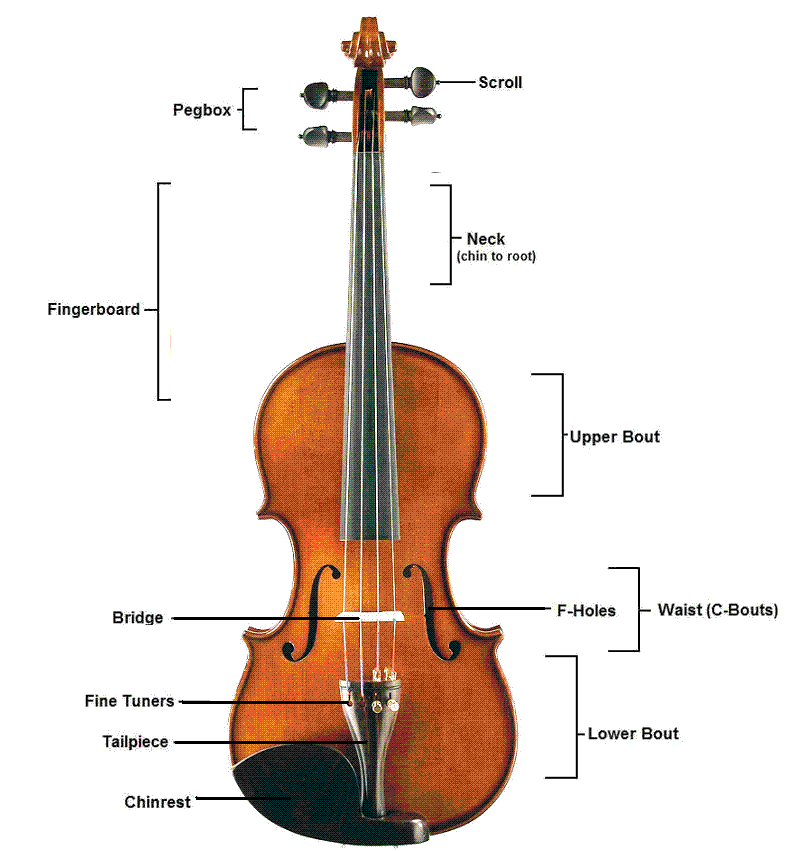 1. Fingerboard (PRSTOHVAT) 2.. Neck(VRAT) 3. Pegbox (KUCICA SA KLINOVIMA) 4. Scroll (SVITAK) 5. Bridge (MOST) 6. Fine Tuners (STIMACI) 7. Tailpiece (STRAZNJI DIO REPA) 8. Chinrest (PODUPIRAC) 9. Lower Bout (NIZI KRUG) 10. Waist (STRUK) 11. F - Holes (F-RUPA) 12. Upper Bout (VISI KRUG)