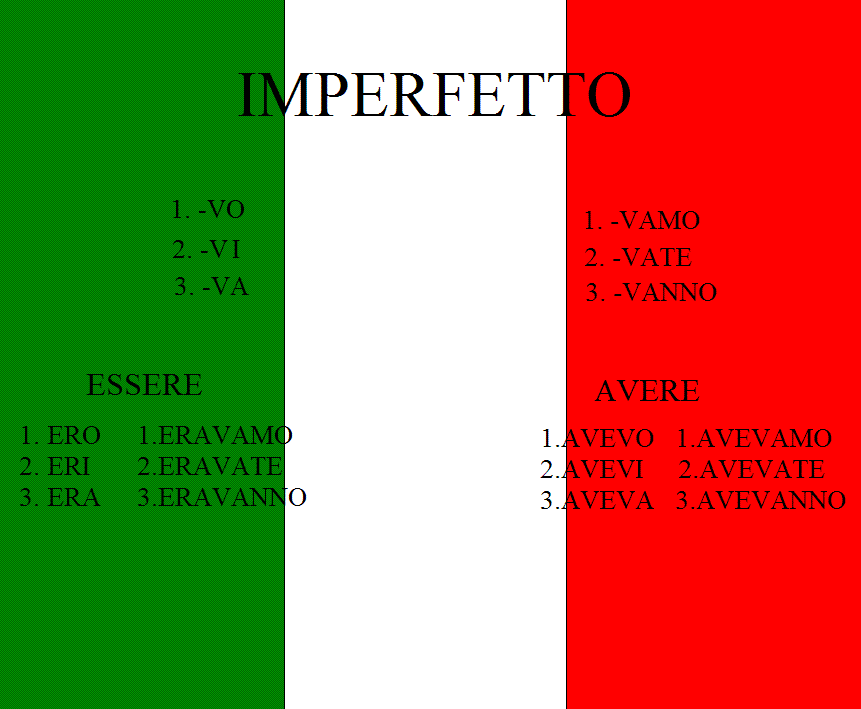 Imperfetto se gradi od infinitivne osnove i nastavaka 1.-vo 2.-vi 3.-va za jedninu i 1.-vamo 2.-vate 3.-vanno za mnozinu.