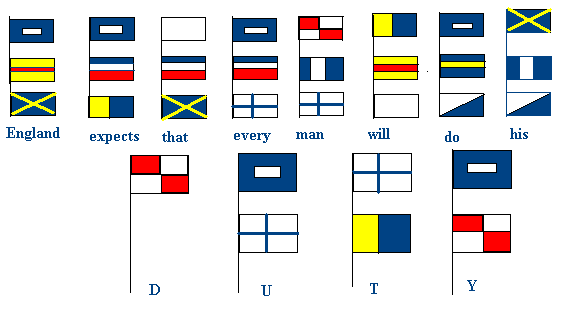 Zastave su i kroz istoriju igrale značajnu ulogu.Čuven je Nelzonov signal kod Trafalgara 1805. godine koji je bio sastavljen od zastavica u grupama po sistemu koji je opisao ser Houp Pophem u svom Rječniku signala. |