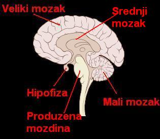 naprednije funkcije u usporedbi s mozgom bilo koje druge vrste. 1. Veliki mozak - centar za inteligenciju (pamćenje, mišljenje, učenje i kontroliranje ponašanja ...) 2.Mali mozak - središte organa za ravnotežu, kontrolira voljne i usklađuje refleksne pokrete 3.Produžena moždina - centar važnih refleksnih procesa 4.Srednji mozak - regulira napetost mišića, refleksno uspostavlja i održava položaj tijela