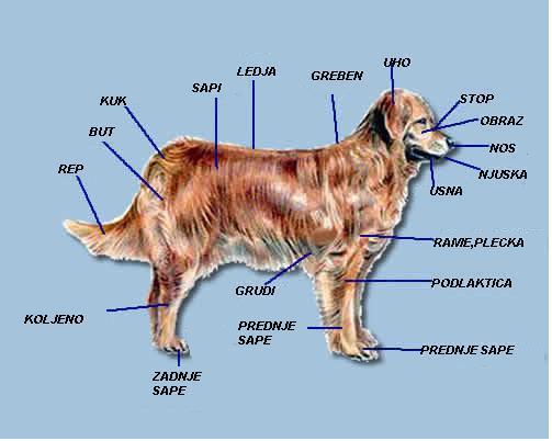 DIJELOVI TIJELA: 1.PREDNJE ŠAPE 2.PODLAKTICA 3.RAME,PLEĆKA 4.GRUDI 5.USNA 6.NJUŠKA 7.NOS 8.OBRAZ 9.STOP 10.UHO 11.GREBEN 12.LEĐA 13.SAPI 14.KUK 15.BUT 16.REP 17.KOLJENO 18.ZADJE ŠAPE 19.PREDNJE ŠAPE |