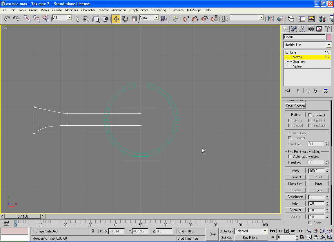 Aktivirajte pogled Top i odaberite Create/Shapes/Line.Pomoću Line ćemo napraviti konture drške kao što smo radili konture oštrice mača.Takođe ovaj korak je proizvoljan i u zavisinosti od Vaše mašte dobićete i izgled drške.