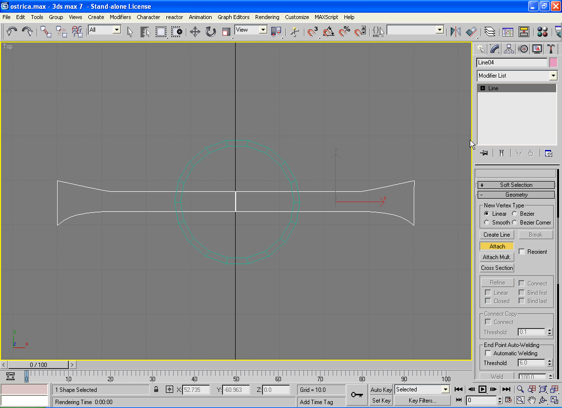 Aktivirajte pogled Top i odaberite Create/Shapes/Line.Pomoću Line ćemo napraviti konture drške kao što smo radili konture oštrice mača.Takođe ovaj korak je proizvoljan i u zavisinosti od Vaše mašte dobićete i izgled drške.