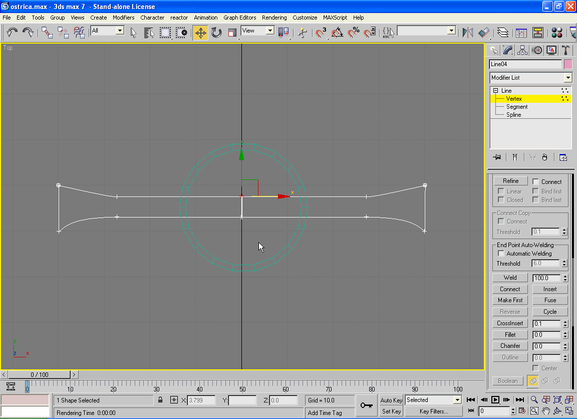 Aktivirajte pogled Top i odaberite Create/Shapes/Line.Pomoću Line ćemo napraviti konture drške kao što smo radili konture oštrice mača.Takođe ovaj korak je proizvoljan i u zavisinosti od Vaše mašte dobićete i izgled drške.