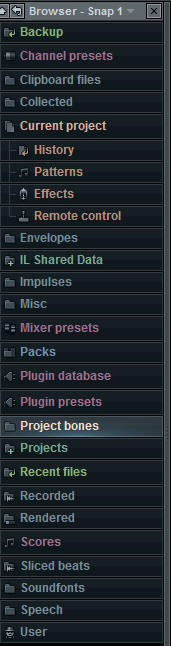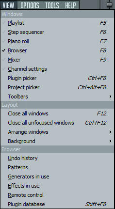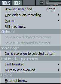 Browser sm... je pretraživač ; Služi sasnimanje audio snimaka u plejlistu ili u editor ; Makroi ; Riff mašina ; Čuvanje audio ili MIDI segmenata u browser; Skor logger služi za čuvanje odsviranih stvari kao piano roll; Last tweaked parametres su opcije koje se primjenjuju na poslednjim promjenama parametara grafičkog interfejsa; External tools se koristi za import alata koji su kompatabilni sa FL S ;