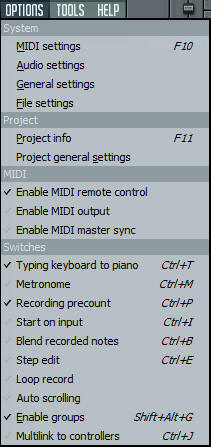 Povezivanje tastature sa instrumentima; Ukljućivanje metronoma ; Odbrojavanje pred snimanje; Startanje snimanja poslije unosa tona; Blend notes spriječava da se snimljeni tonovi snime preko starih tonova; Step edit mode se koristi da se tonovi koje kucamo unose u piano roll; Loop record i Auto scrolling se odnose na pregled plejliste tokom snimanja i slušanja; Odobrava grupaciju kanala, automatizacija... Vrši povezivanje kontrolera sa FLS; |