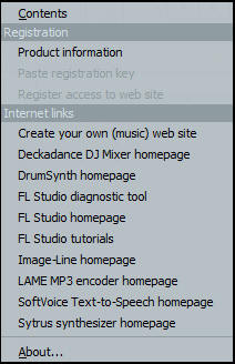 Registration i internet links podmeni se odnose na stvari koje Image-Line nudi (websajtovi i dl paketi)