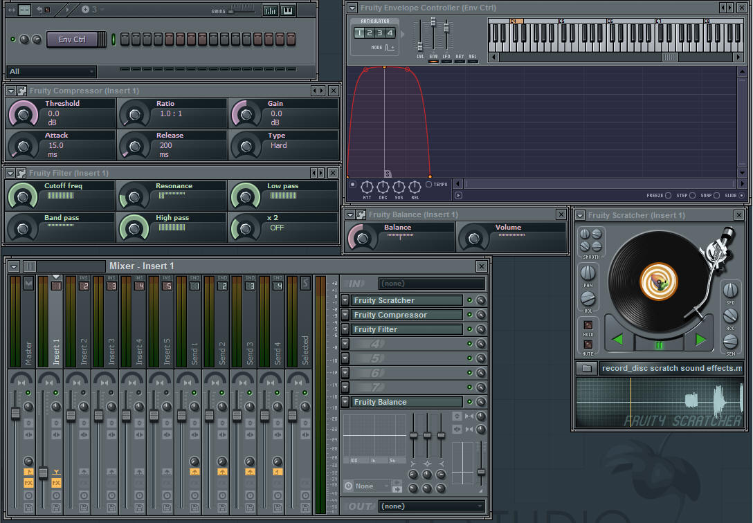 Skrečer koristimo tako što u posebnoj mikser traci otvaramo effekte: FL Scratcher , Fruity Copressor , Fruity Filter.A u sekvencer dodajemo Envelope controller.