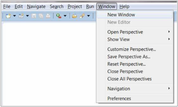Window menu dozvoljava da otvaramo i zatvaramo poglede (views) i perspektive. On takođe dozvoljava da pozovemo Preferences dijalog.