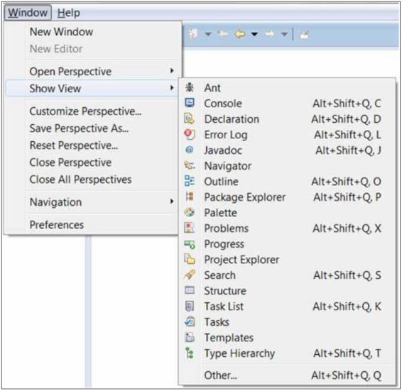 Eclipse perspektiva može pokazati bilo koji broj pogleda i editora. Sve instance editora se javljaju u jednom editor prostoru, dok su pogledi (views) smješteni unutar view foldera. Workbench prozor može prikazati bilo koji broj view foldera. Svaki view folder može prikazati jedan ili više pogleda.