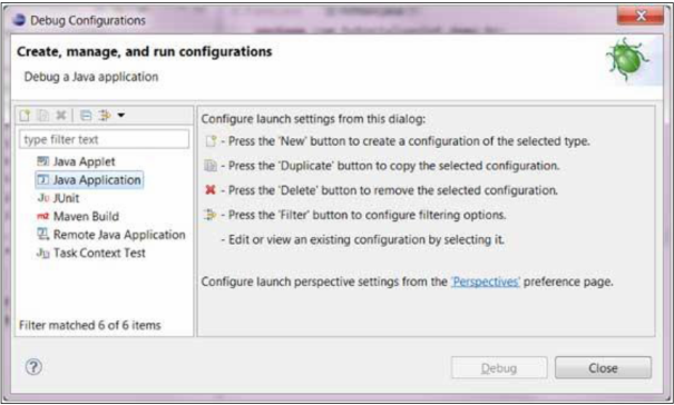 Eclipse debug konfiguracija je slična run konfiguraciji ali se koristi za startanje aplikacije u debug modu. Zato što je aplikacija startana u debug modu korisnici se obavještavaju da se prebace u debug perspektivu. Debug perspektiva nudi određen broj pogleda (views) koji su pogodni za debagovanje aplikacija.