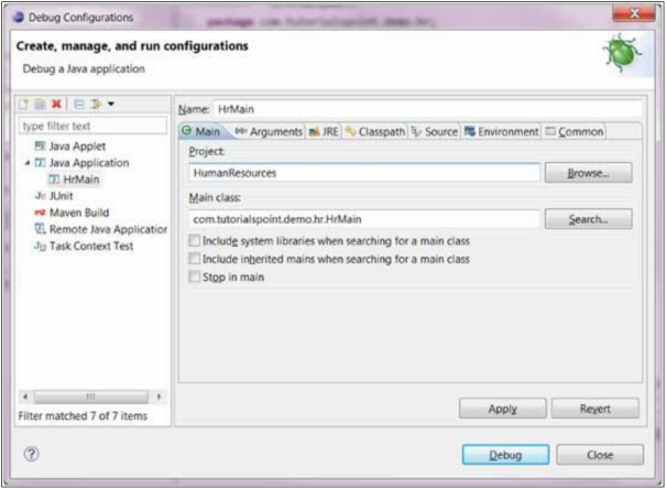 Debug Configuration dijalog može se pozvati selektovanjem Debug Configurations menu stavke iz Run menija.