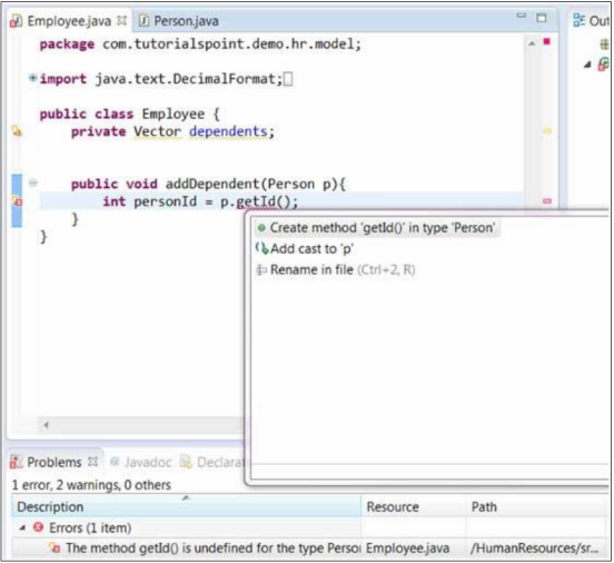 Na slici gore, getId je podvučeno zato što klasa Person nema metod koji se zove getId(). Selektovanje "Create method 'getId()' in type 'Person''' će uzrokovati da getId() metod bude dodat klasi Person.