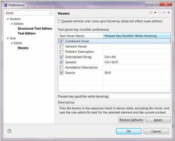 Java editor je asociran sa različitim tipovima hovera (tzv. lebdeće pomoći). Hover obezbjeđuje dodatne informacije o elementu pod pokazivačem miša. Svi hoveri asocirani sa java editorom mogu se vidjeti na Java editor Hovers preference stranici.