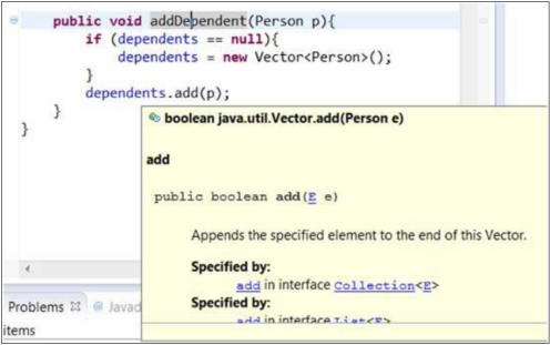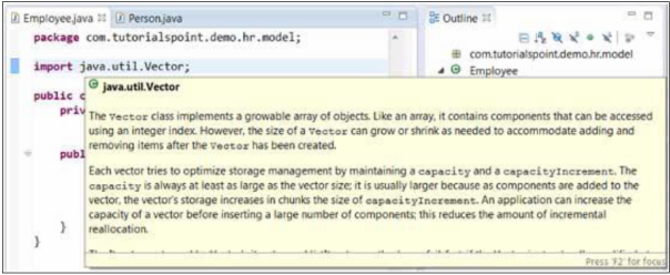 U java editoru, postavljanje pokazivača miša iznad klase koja se importuje pokazuje java doc asociran sa tom klasom.