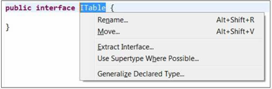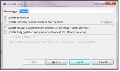 Preimenovanje klase koja je široko korištena u čitavom projektu može oduzeti mnogo vremena ali Eclipse refactoring Wizard olakšava posao automatskim detektovanjem svih zavisnosti (dependencies) od klase koja se preimenuje i takođe njihovim modifikova-njem.