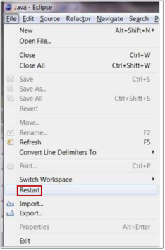 Restart opcija dozvoljava korisnicima da restartuju eclipse. Da restartujemo eclipse, kliknemo na File menu i selektujemo Restart menu stavku.