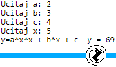 6.4.. Napisati program koji za učitano x ispisuje vrijednost y po formuli: b) y = ax2 + bx + c.