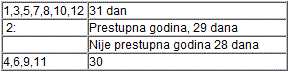Napisati program za ispis broja dana u mjesecu, prema slijedećoj tabeli (Rješenje sa provjerom prestupnosti godina djeljivih sa 100):