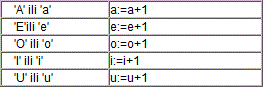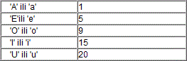 Napisati program koji za upisani samoglasnik ispisuje redni broj samoglasnika u abecedi, prema slijedećoj tabeli: