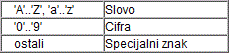 Napisati program koji odredjuje da li je zadani znak slovo, cifra ili specijalna znak, prema slijedećoj tabeli: