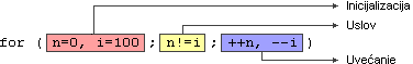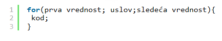 for(<inicijalizacija>;<uslov izvrsavanja petlje>;<izraz za inkrementiranje>){