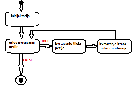 Ako je uslov izvrsavanja petlje ispunjen izvrsava se tijelo petlje, u suprotno se ne izvrsava.Nakon svakog ponavljanja izvrsava se izraz za ikrementiranje.