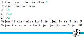 10.2.. Učitati niz X od n članova. Naći minimum i maksimum članova koji su djeljivi sa 5.