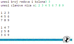 109.1.. Učitati dvodimenzionalni niz X i formirati drugi dvodimenzionalni niz Y čiji je opšti član: yi,j = xj,i (elementi i-tog reda matrice X se razmjenjuju sa elementima i-te kolone matrice Y). Ispisati oba niza.