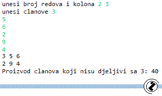 109.4.. Učitati dvodimenzionalni niz - matricu nxm. Izračunati i ispisati proizvod elemenata koji nisu djeljivi sa 3.