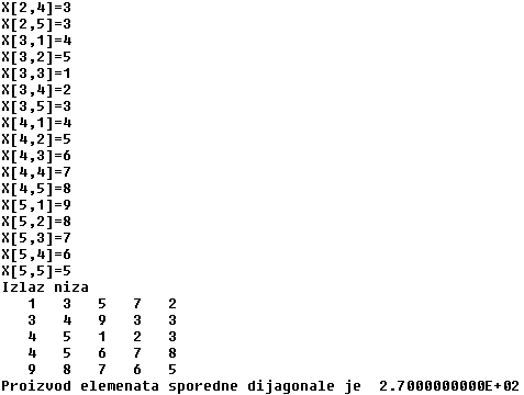 Opis programa: Sporedna dijagonala - Elementi a0,n-1, a1,n-2, ..., an-1,0 čine sporednu dijagonalu. Sporednu dijagonalu čine elementi čiji indeksi zadovoljavaju izraz i+j = niz.length-1. Indeksi elemenata matrice iznad sporedne dijagonale zadovoljavaju nejednačinu i+j > niz.length-1, a elemente ispod sporedne dijagonale zadovoljavaju nejednačinu i+j < niz.length-1.