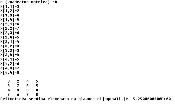System.out.print("Aritmeticka sredina clanova glavne dijagonale: " + s/br);
