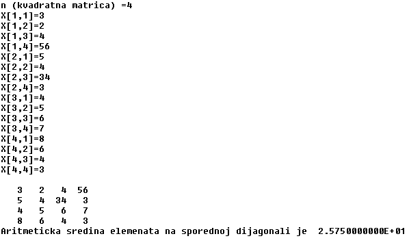 109.3.. Učitati dvodimenzionalni niz - matricu nxm. Izračunati i ispisati aritmetičku sredinu elemenata u sporednoj dijagonali niza X[n,m]
