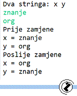 15.4.2. Napisati program koji izvodi zamjenu vrijednosti dva stringa bez korišćenja privemene varijable.