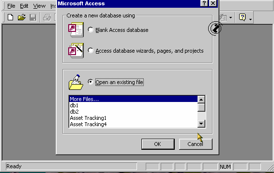 box gdje biramo šta želimo raditi. Možemo stvoriti novu bazu ili otvoriti
