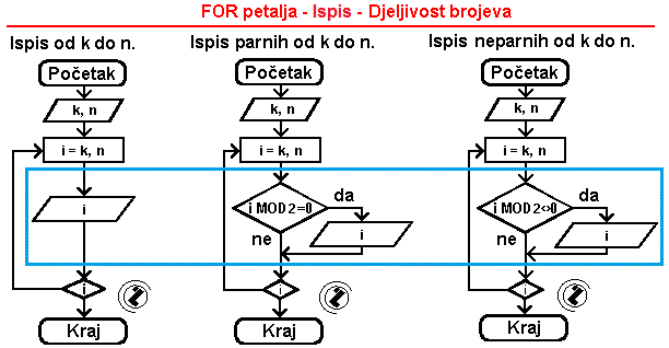 Primjer 1. Ispis, ispis parnih i neparnih od K do N - FOR petlja.Opis rješenja: Prikazana su rješenja u 3 petlje: