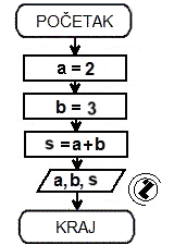 6.4.. Vrijednost varijable a je dva, varijable b je tri, rezultat njihove sume pridužuti varijabli s. Ispisati sve varijable.