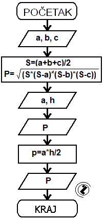 - izlaz - ispisati: "Povrsina trougla po formuli P=a*h/2 iznosi:"; P