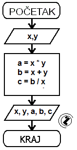 - izlaz - ispisati: "x = ",x, "y = ",y, "a = ",a, "b = ",b, "c = ",c