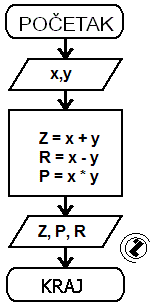 - izlaz - ispisati: "Suma iznosi:"; Z, "Proizvod iznosi:"; P, "Razlika iznosi:"; R