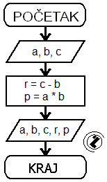 - izlaz - ispisati: "razlika trećeg i prvog = "; r, "proizvod prvog i drugog = "; p