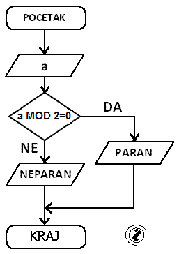- Logički uslov: a / 2 = INT(a / 2) ili a MOD 2 = 0 ili a % 2 == 0