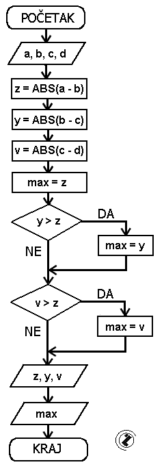 7.2.. Naći najveću razliku između 4 učitana broja. Poredi se razlika susjednih bojeva.