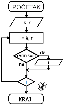 8.1.. Ispis prirodnih brojeva djeljivih sa 5 od k do n.