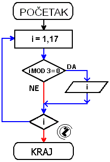- ako je i djeljivo sa 3 ispisati vrijednost promjenljive i, inače idi na korak 4