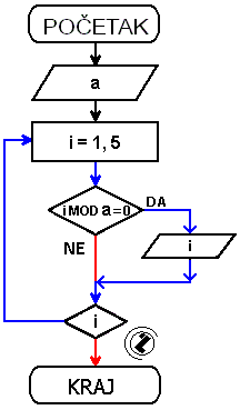 - ako je i djeljivo sa a ispisati vrijednost promjenljive i, inače idi na korak 4