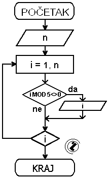 8.1.. Ispis prirodnih brojeva od 1 do n koji nisu djeljivi sa 5.