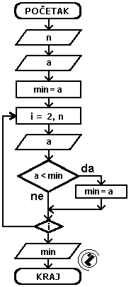 ako je učitani broj (a) manji od minimuma (a<min) taj broj postaje minimum (min=a)