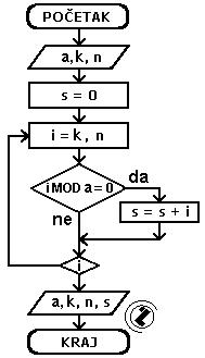 - ispisati granice (k, n), broj za provjeru djeljivosti (a) i izračunatu sumu (s)