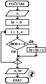 ako je i djeljivo sa 3 uvečati brojač (br=br+1)